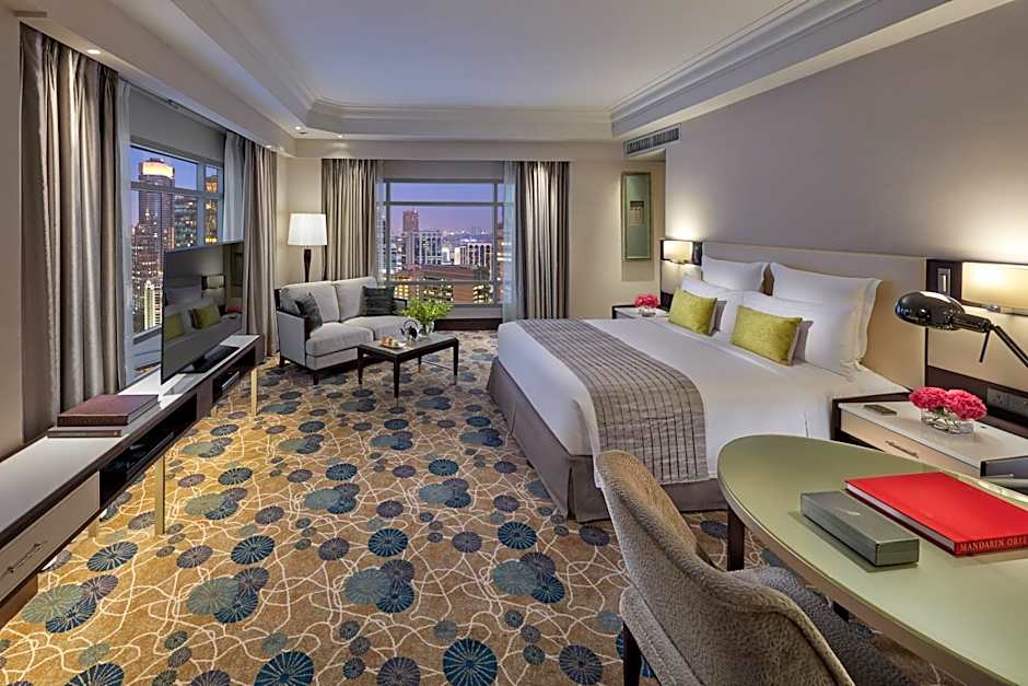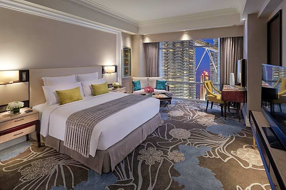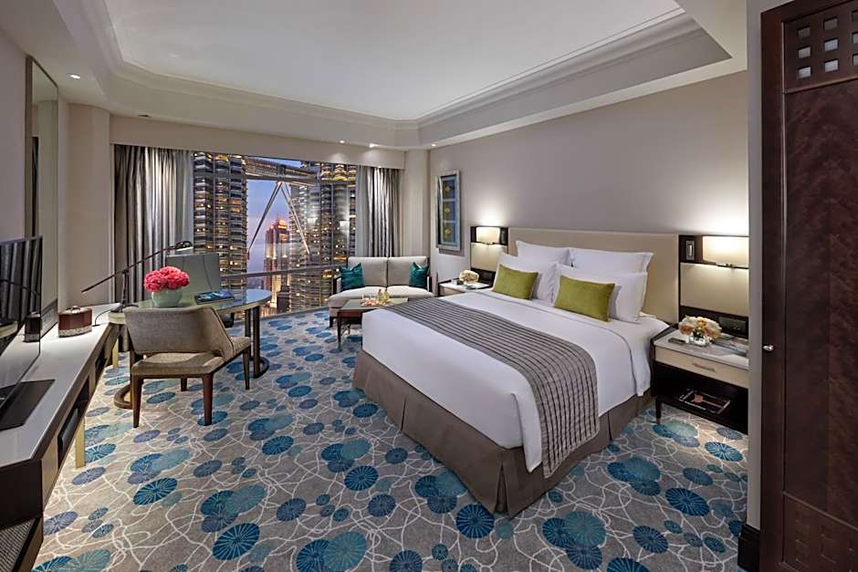 This spacious one-bedroom suite feature a king bed and desk in the bedroom, and a sofa, armchairs and a dining table for four in the living room. The suite offers an unrivaled view of one of the most recognized buildings in the world; the Petronas Twin Towers.